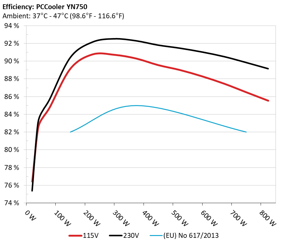The PSU`s efficiency under high ambient temperatures with 115V and 230V input. For this graph the results of the 10-110% load regulation table are used