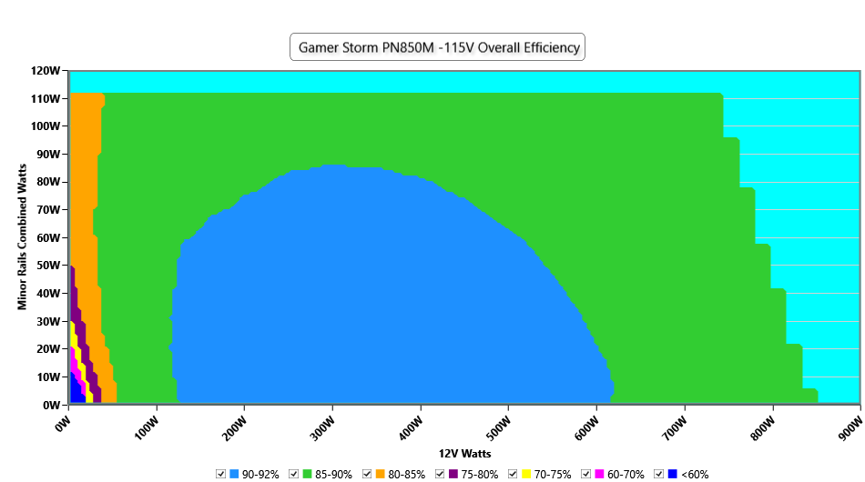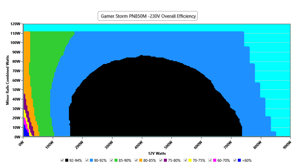 This graph depicts the PSU`s efficiency throughout its entire operational range. For the generation of the efficiency and noise graphs we set our loaders to auto mode through our custom-made software before trying thousands of possible load combinations