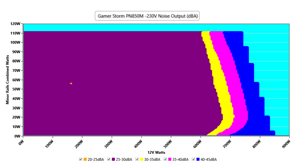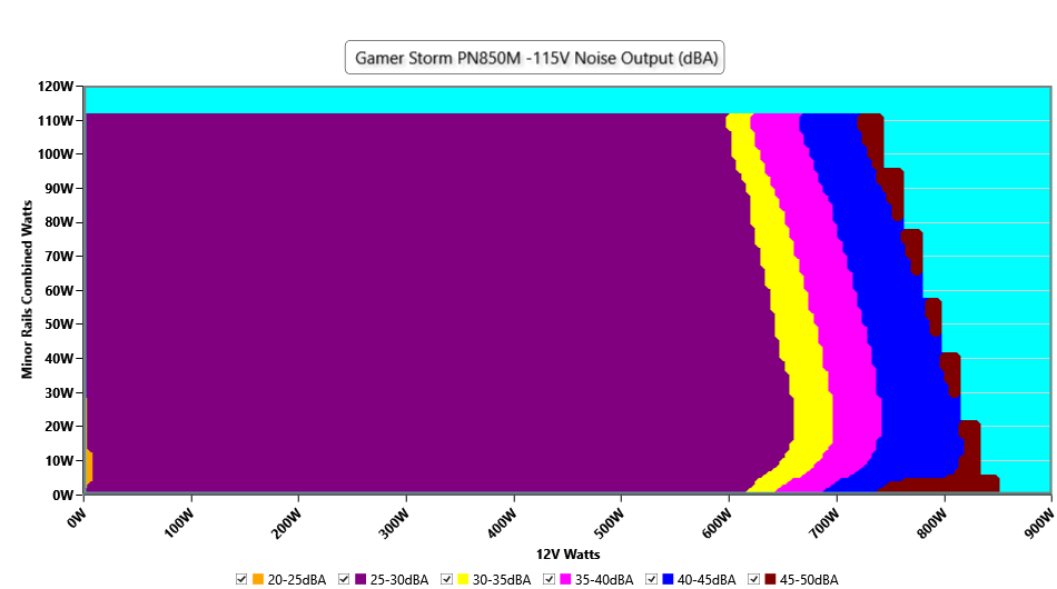 The PSU`s noise in its entire operational range and under 30-32 °C ambient is depicted in this graph. The X axis represents the load on the +12V rail(s) while the Y axis is the load on the minor rails