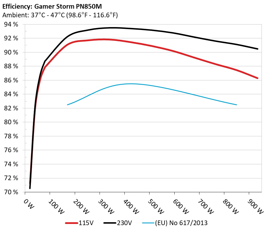 The PSU`s efficiency under high ambient temperatures with 115V and 230V input. For this graph the results of the 10-110% load regulation table are used
