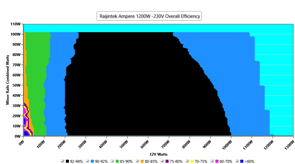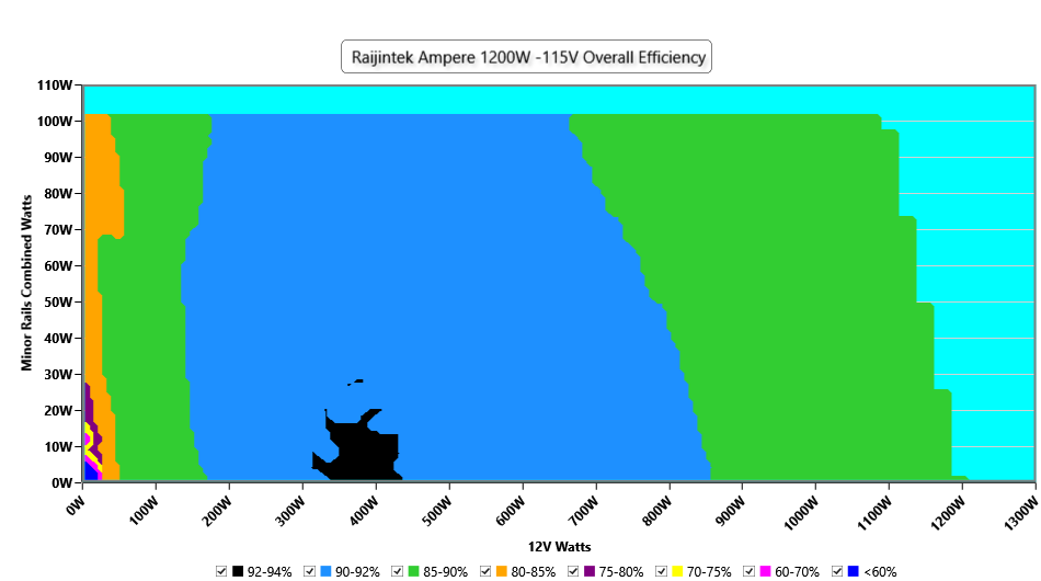 This graph depicts the PSU`s efficiency throughout its entire operational range. For the generation of the efficiency and noise graphs we set our loaders to auto mode through our custom-made software before trying thousands of possible load combinations