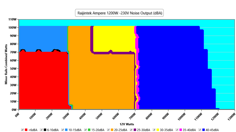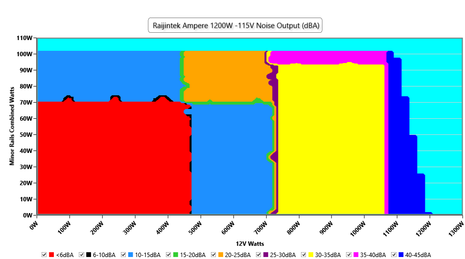 The PSU`s noise in its entire operational range and under 30-32 °C ambient is depicted in this graph. The X axis represents the load on the +12V rail(s) while the Y axis is the load on the minor rails