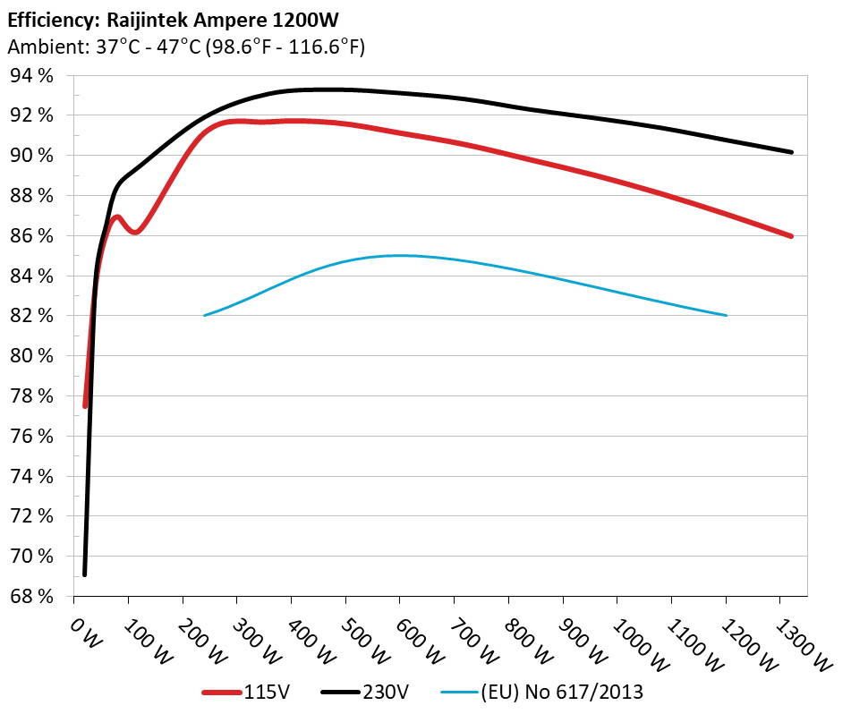 The PSU`s efficiency under high ambient temperatures with 115V and 230V input. For this graph the results of the 10-110% load regulation table are used
