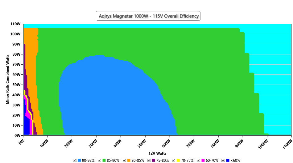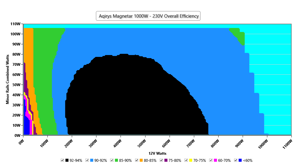 This graph depicts the PSU`s efficiency throughout its entire operational range. For the generation of the efficiency and noise graphs we set our loaders to auto mode through our custom-made software before trying thousands of possible load combinations