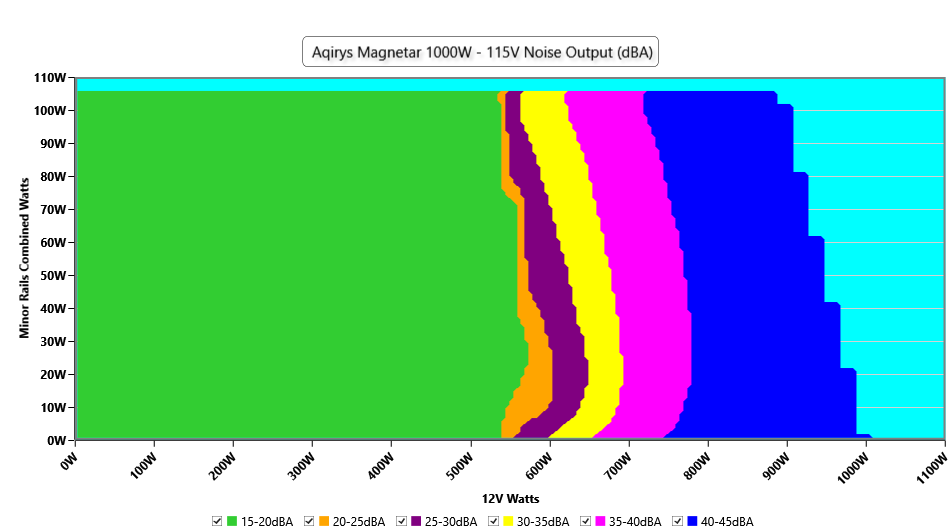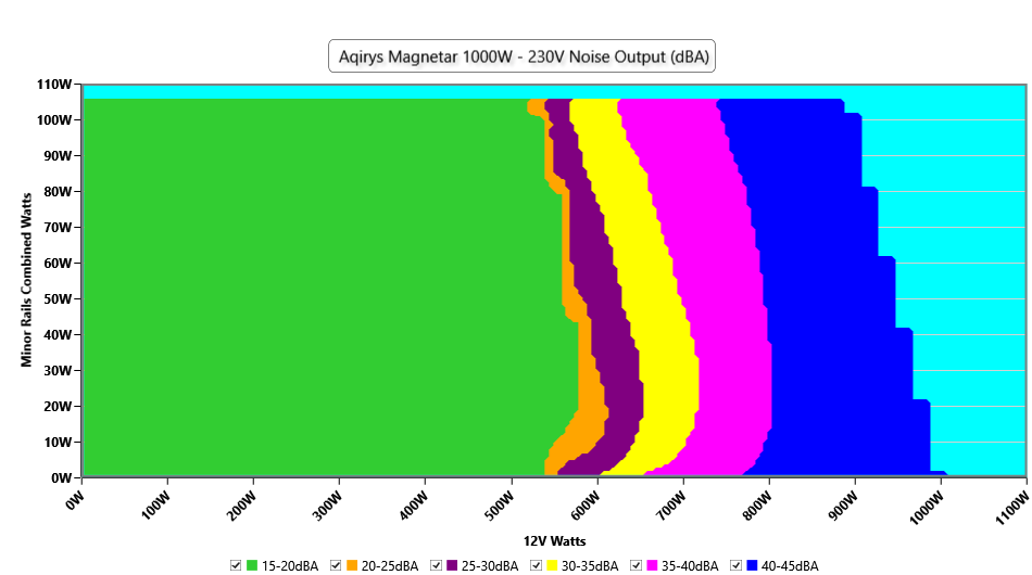 The PSU`s noise in its entire operational range and under 30-32 °C ambient is depicted in this graph. The X axis represents the load on the +12V rail(s) while the Y axis is the load on the minor rails