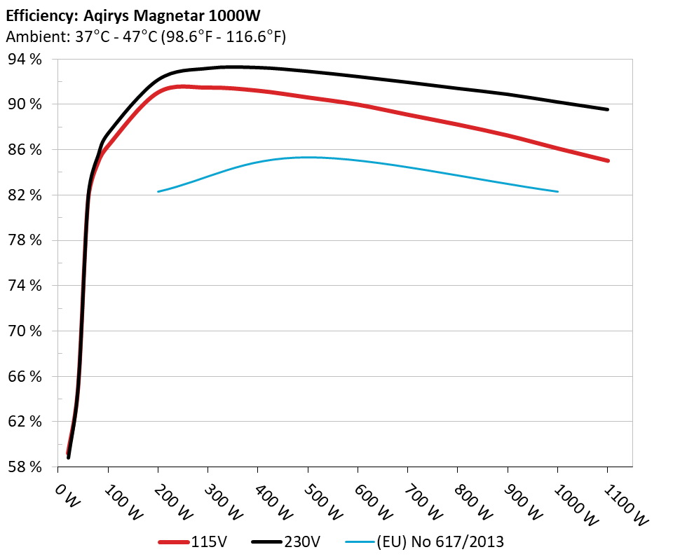 The PSU`s efficiency under high ambient temperatures with 115V and 230V input. For this graph the results of the 10-110% load regulation table are used