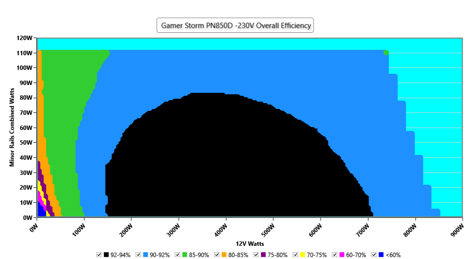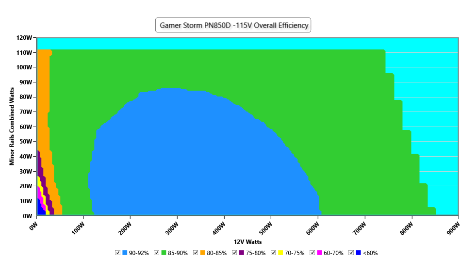 This graph depicts the PSU`s efficiency throughout its entire operational range. For the generation of the efficiency and noise graphs we set our loaders to auto mode through our custom-made software before trying thousands of possible load combinations