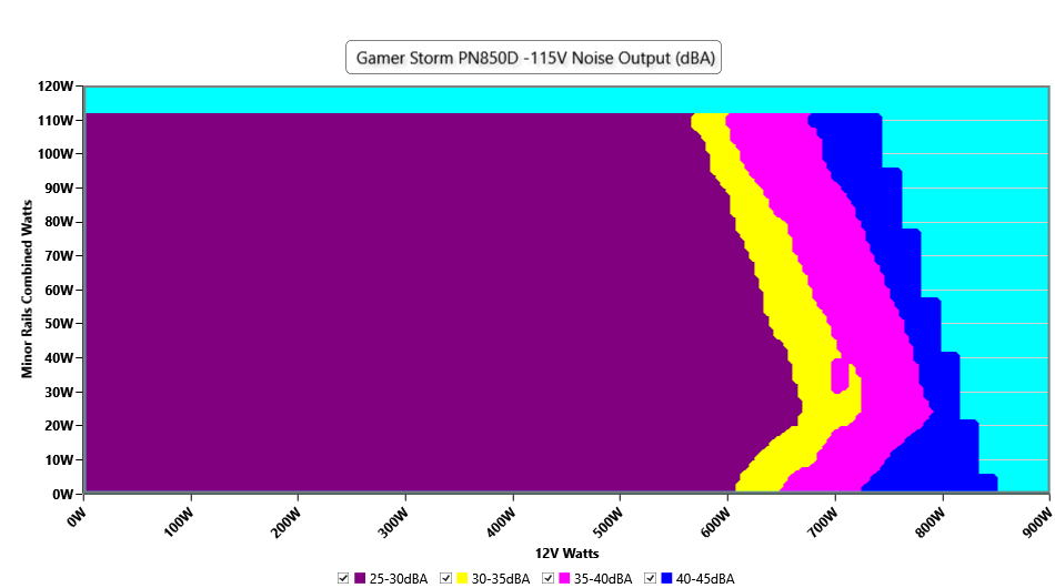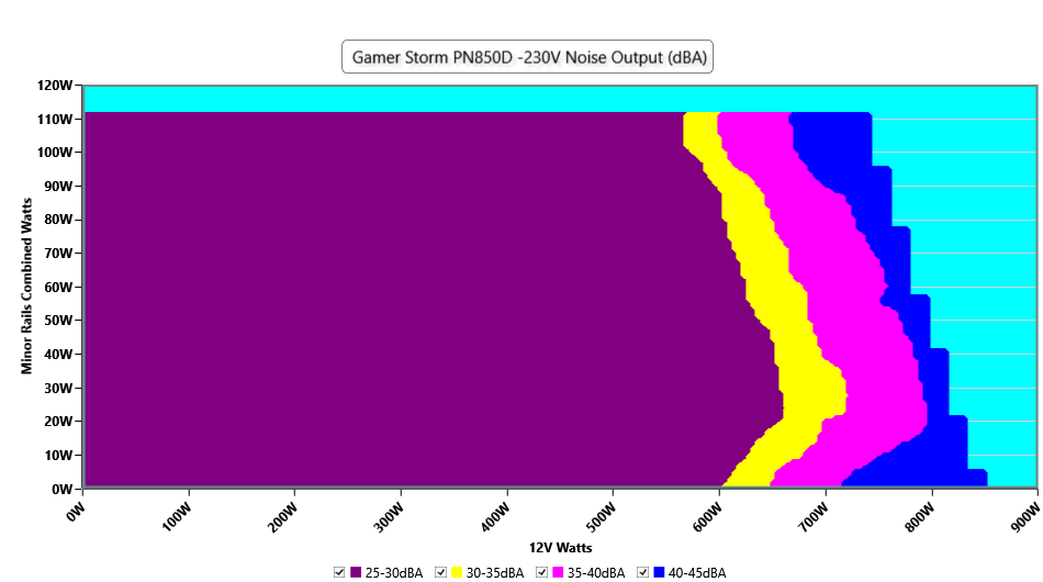 The PSU`s noise in its entire operational range and under 30-32 °C ambient is depicted in this graph. The X axis represents the load on the +12V rail(s) while the Y axis is the load on the minor rails