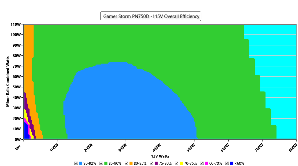 This graph depicts the PSU`s efficiency throughout its entire operational range. For the generation of the efficiency and noise graphs we set our loaders to auto mode through our custom-made software before trying thousands of possible load combinations