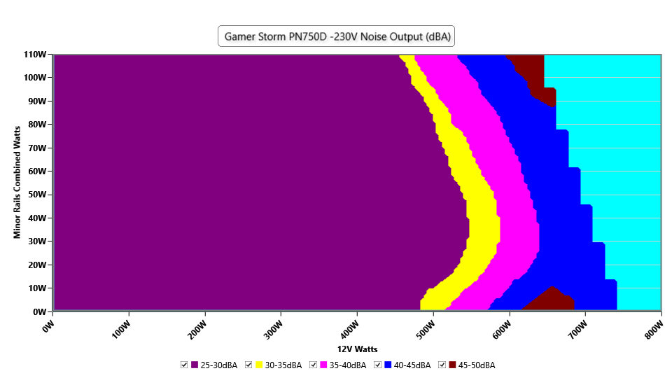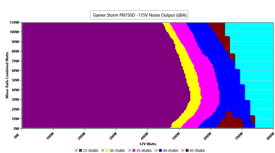 The PSU`s noise in its entire operational range and under 30-32 °C ambient is depicted in this graph. The X axis represents the load on the +12V rail(s) while the Y axis is the load on the minor rails