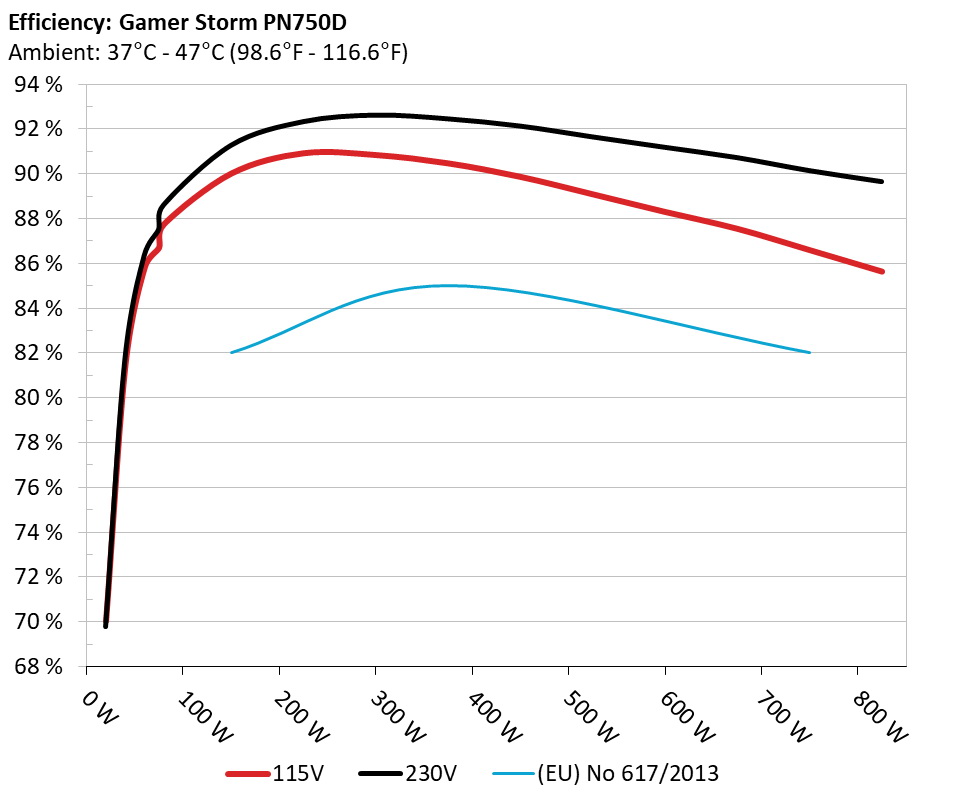 The PSU`s efficiency under high ambient temperatures with 115V and 230V input. For this graph the results of the 10-110% load regulation table are used