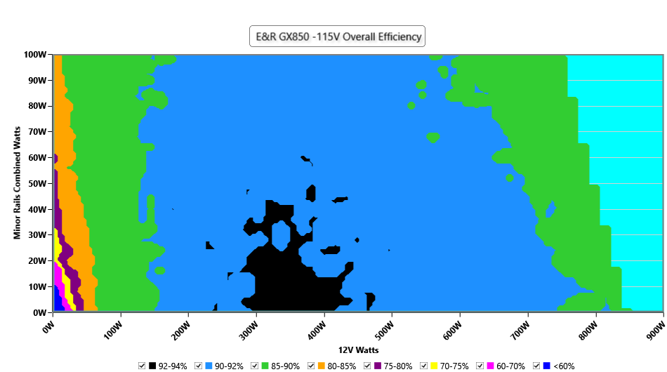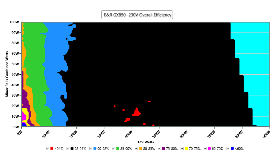 This graph depicts the PSU`s efficiency throughout its entire operational range. For the generation of the efficiency and noise graphs we set our loaders to auto mode through our custom-made software before trying thousands of possible load combinations
