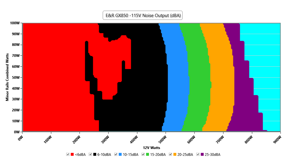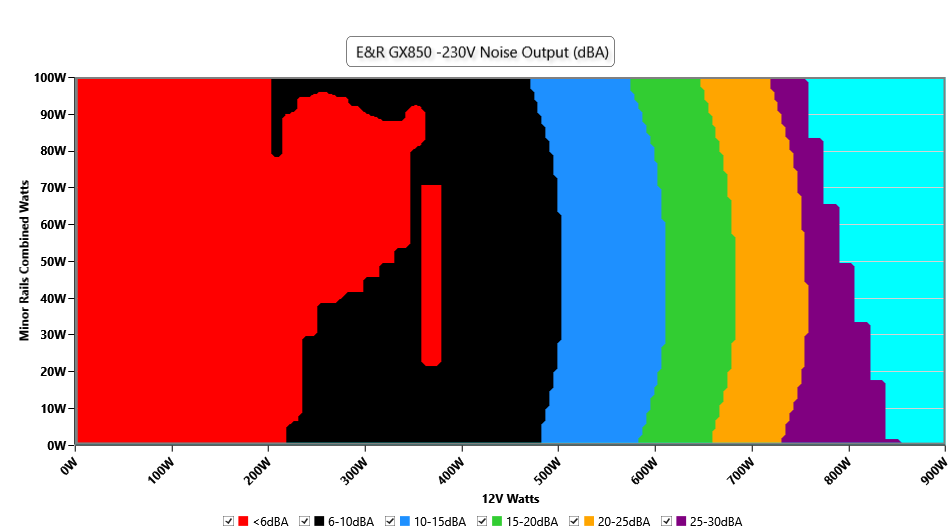 The PSU`s noise in its entire operational range and under 30-32 °C ambient is depicted in this graph. The X axis represents the load on the +12V rail(s) while the Y axis is the load on the minor rails