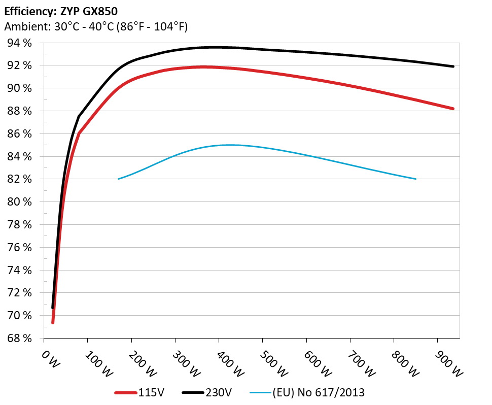 The PSU`s efficiency under high ambient temperatures with 115V and 230V input. For this graph the results of the 10-110% load regulation table are used