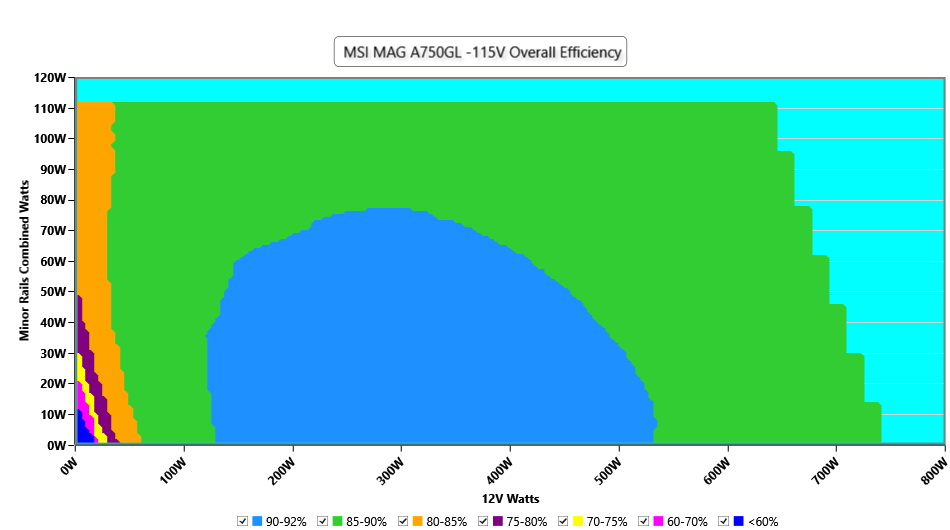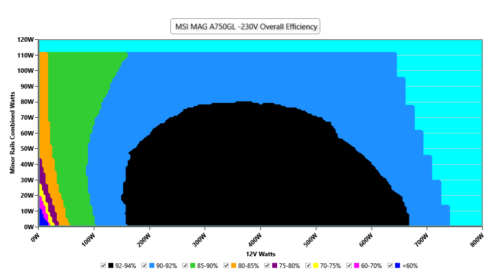 This graph depicts the PSU`s efficiency throughout its entire operational range. For the generation of the efficiency and noise graphs we set our loaders to auto mode through our custom-made software before trying thousands of possible load combinations