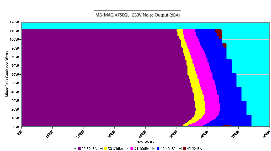The PSU`s noise in its entire operational range and under 30-32 °C ambient is depicted in this graph. The X axis represents the load on the +12V rail(s) while the Y axis is the load on the minor rails