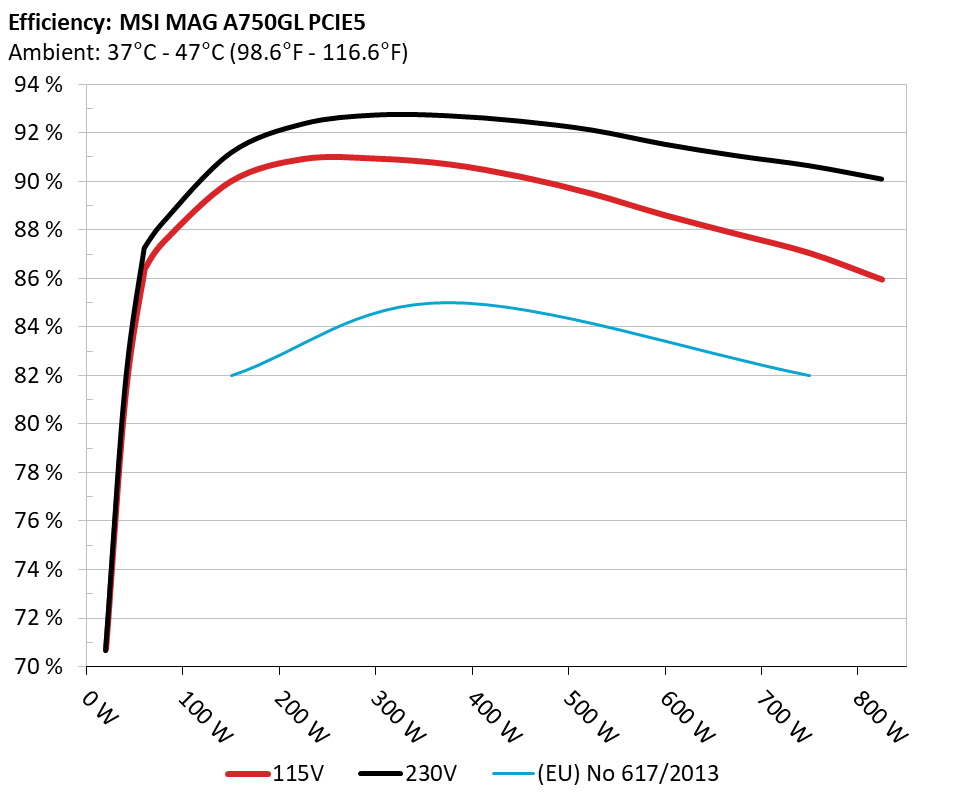 The PSU`s efficiency under high ambient temperatures with 115V and 230V input. For this graph the results of the 10-110% load regulation table are used