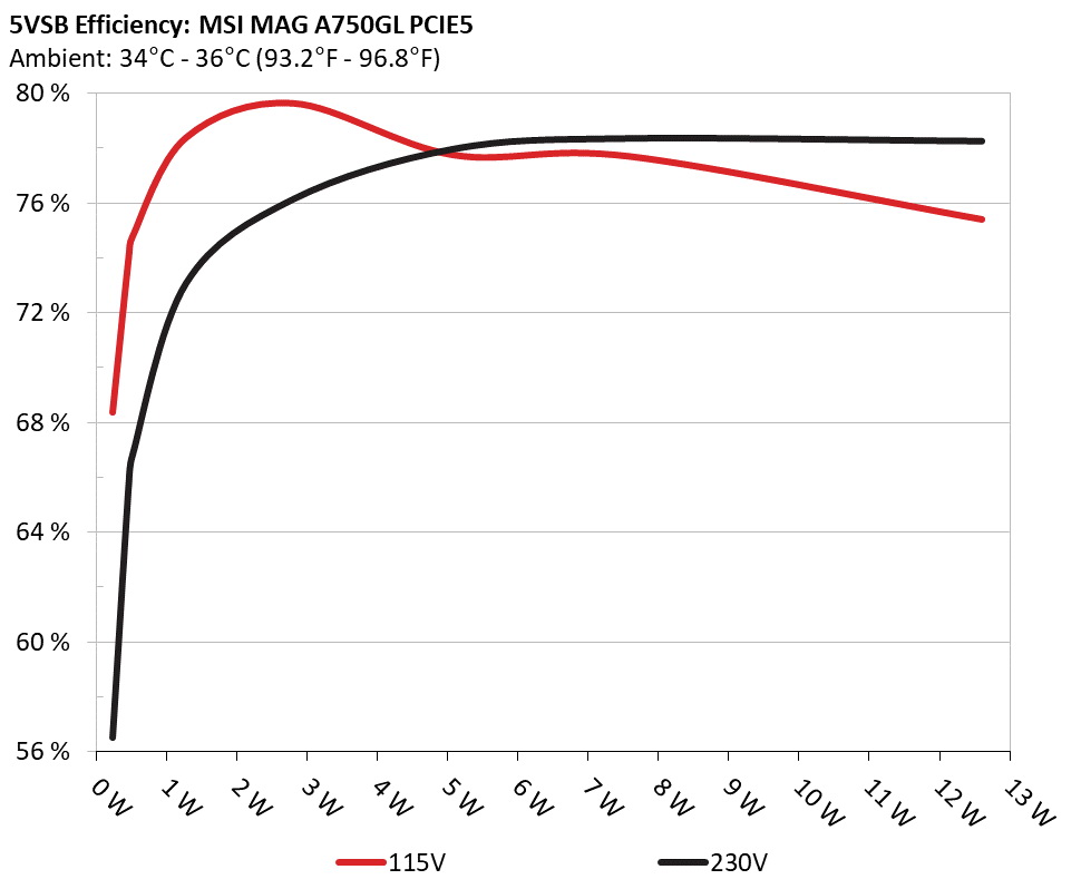 This graph depicts the efficiency levels of the 5VSB rail with 115V and 230V input