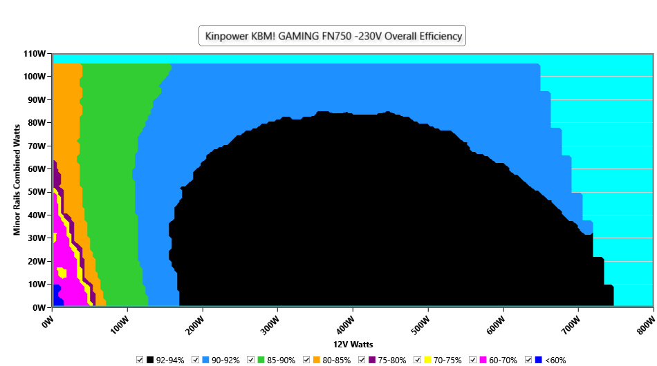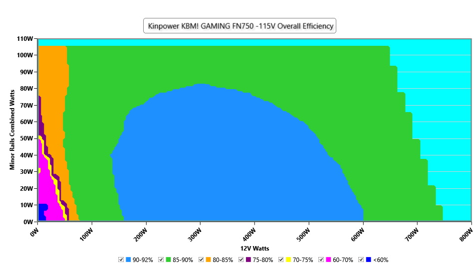 This graph depicts the PSU`s efficiency throughout its entire operational range. For the generation of the efficiency and noise graphs we set our loaders to auto mode through our custom-made software before trying thousands of possible load combinations