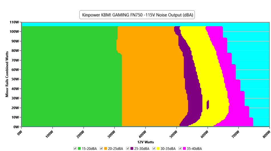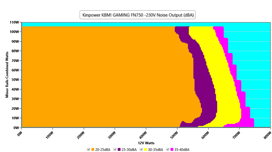 The PSU`s noise in its entire operational range and under 30-32 °C ambient is depicted in this graph. The X axis represents the load on the +12V rail(s) while the Y axis is the load on the minor rails