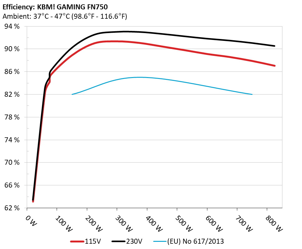 The PSU`s efficiency under high ambient temperatures with 115V and 230V input. For this graph the results of the 10-110% load regulation table are used