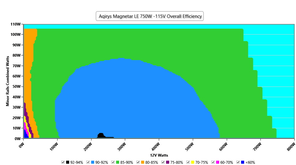 This graph depicts the PSU`s efficiency throughout its entire operational range. For the generation of the efficiency and noise graphs we set our loaders to auto mode through our custom-made software before trying thousands of possible load combinations