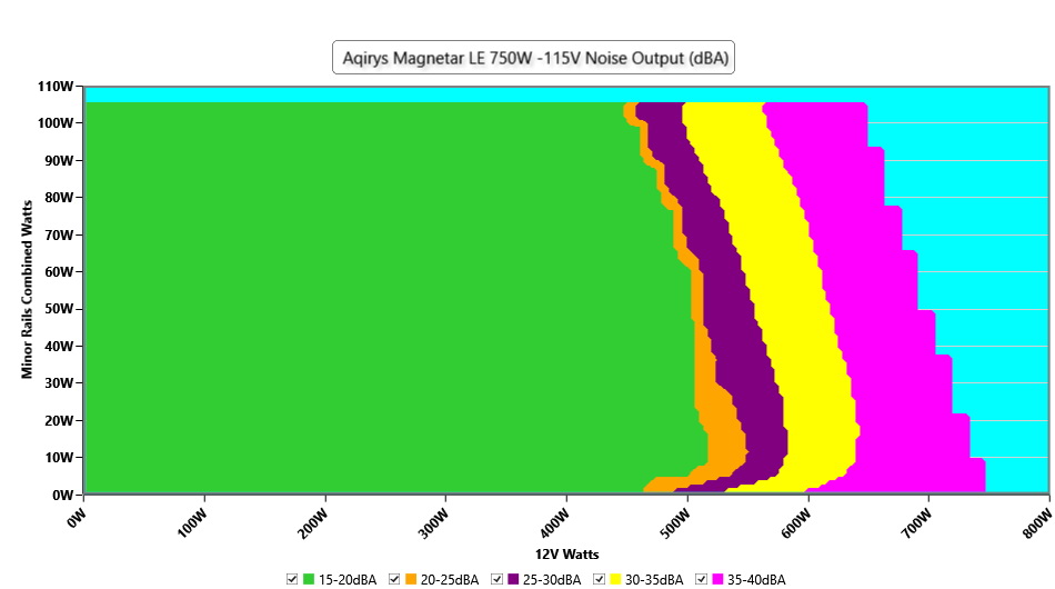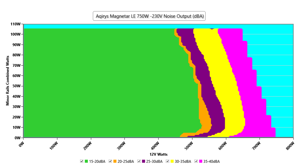 The PSU`s noise in its entire operational range and under 30-32 °C ambient is depicted in this graph. The X axis represents the load on the +12V rail(s) while the Y axis is the load on the minor rails