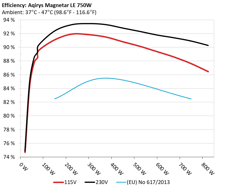 The PSU`s efficiency under high ambient temperatures with 115V and 230V input. For this graph the results of the 10-110% load regulation table are used