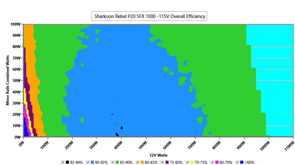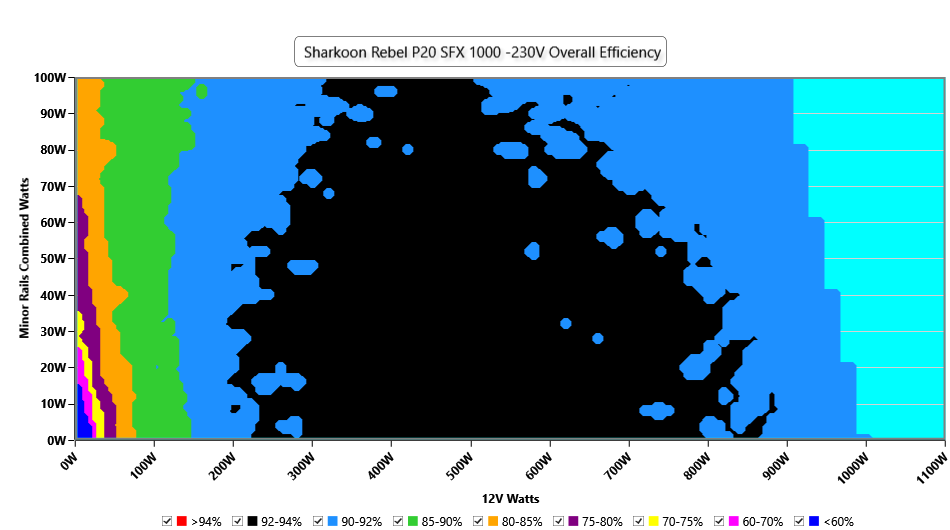 This graph depicts the PSU`s efficiency throughout its entire operational range. For the generation of the efficiency and noise graphs we set our loaders to auto mode through our custom-made software before trying thousands of possible load combinations