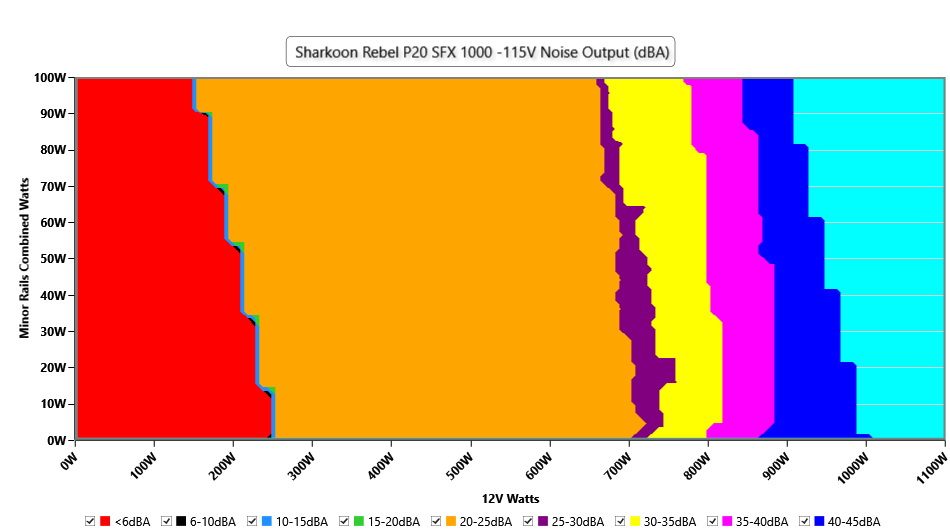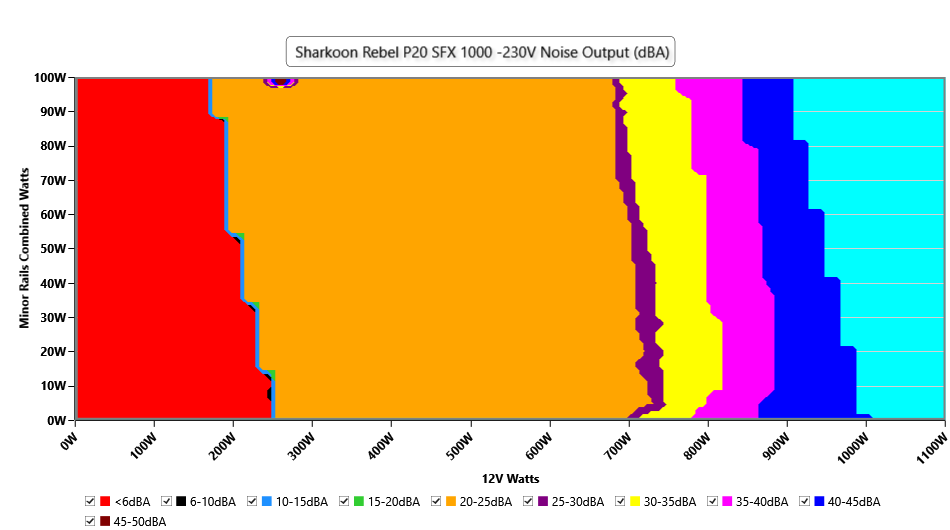 The PSU`s noise in its entire operational range and under 30-32 °C ambient is depicted in this graph. The X axis represents the load on the +12V rail(s) while the Y axis is the load on the minor rails
