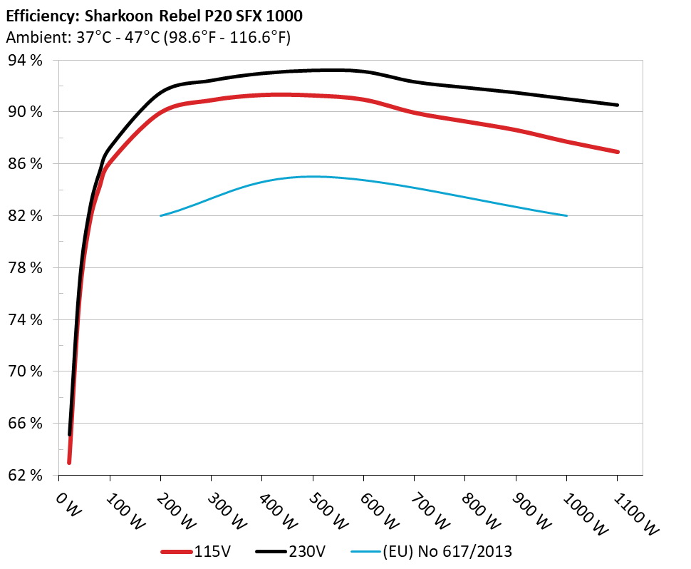 The PSU`s efficiency under high ambient temperatures with 115V and 230V input. For this graph the results of the 10-110% load regulation table are used