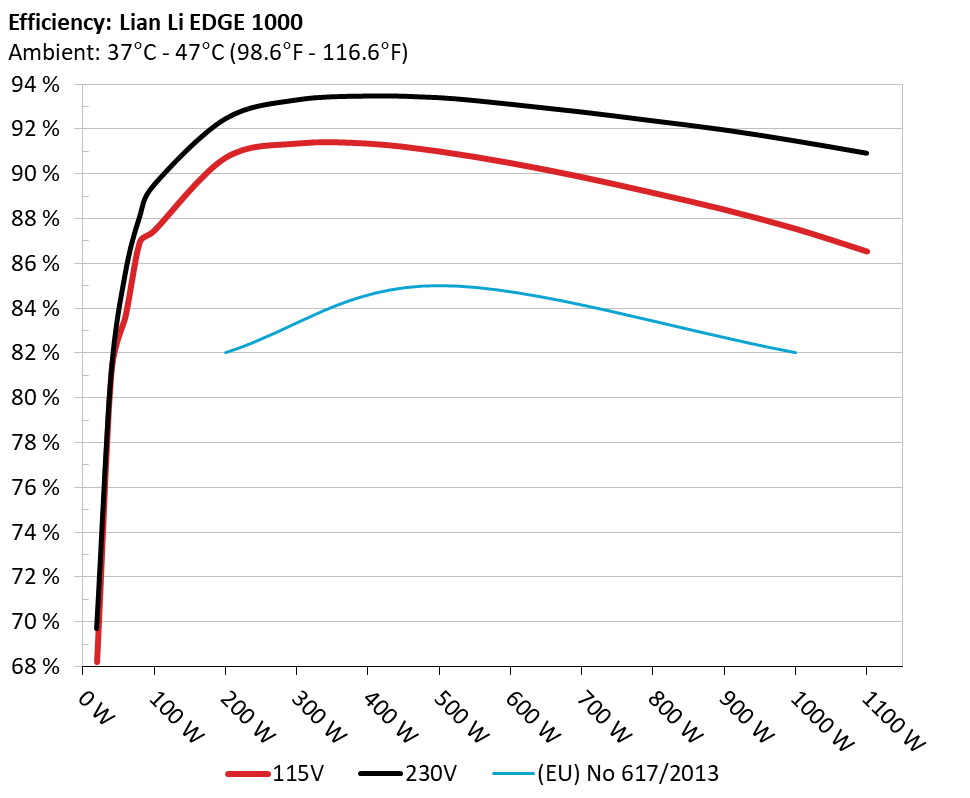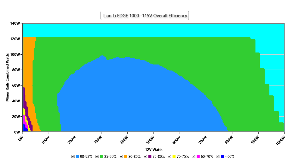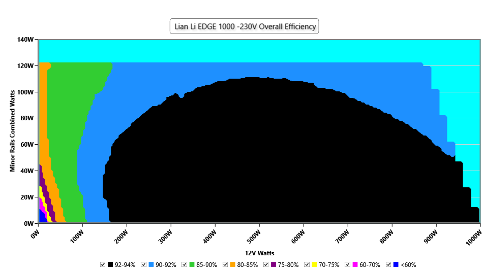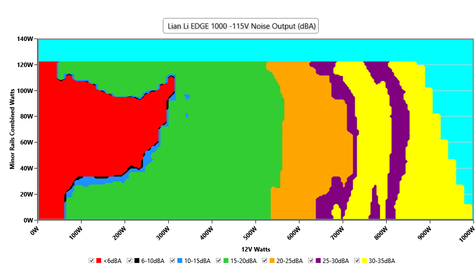 This graph depicts the PSU`s efficiency throughout its entire operational range. For the generation of the efficiency and noise graphs we set our loaders to auto mode through our custom-made software before trying thousands of possible load combinations