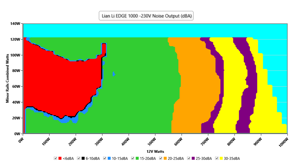 The PSU`s noise in its entire operational range and under 30-32 °C ambient is depicted in this graph. The X axis represents the load on the +12V rail(s) while the Y axis is the load on the minor rails