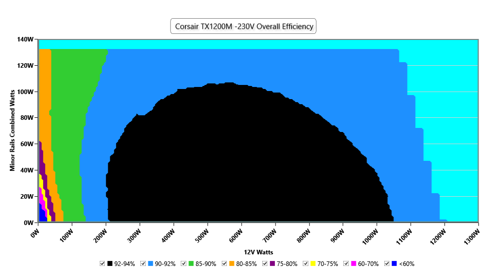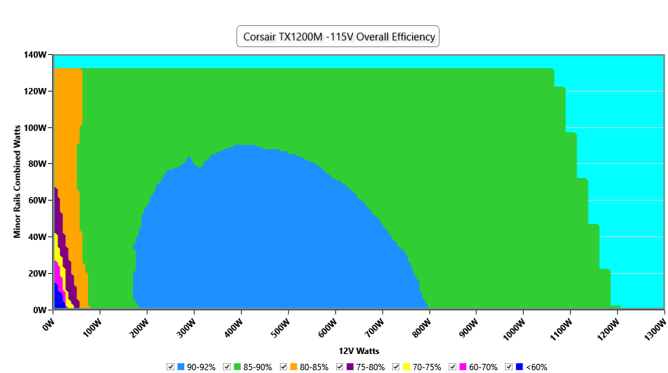 This graph depicts the PSU`s efficiency throughout its entire operational range. For the generation of the efficiency and noise graphs we set our loaders to auto mode through our custom-made software before trying thousands of possible load combinations