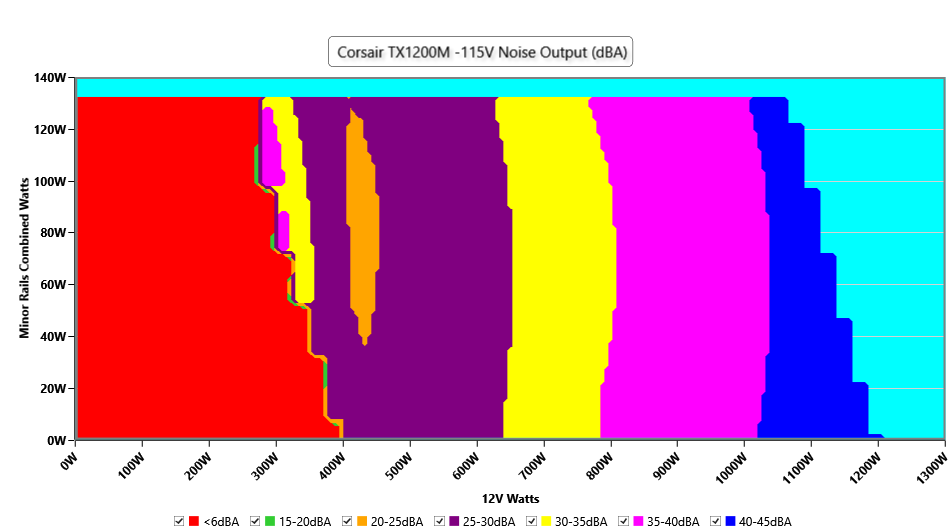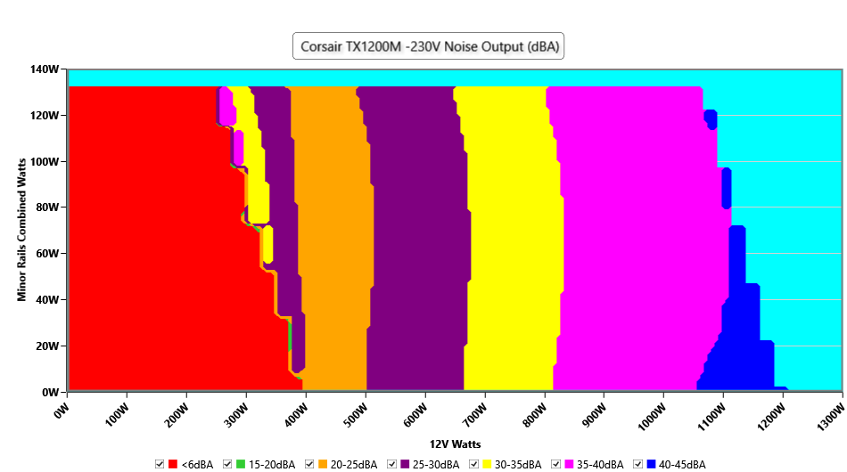 The PSU`s noise in its entire operational range and under 30-32 °C ambient is depicted in this graph. The X axis represents the load on the +12V rail(s) while the Y axis is the load on the minor rails
