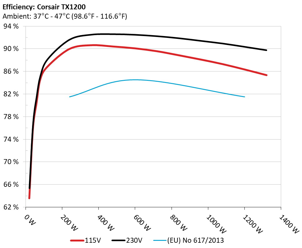 The PSU`s efficiency under high ambient temperatures with 115V and 230V input. For this graph the results of the 10-110% load regulation table are used
