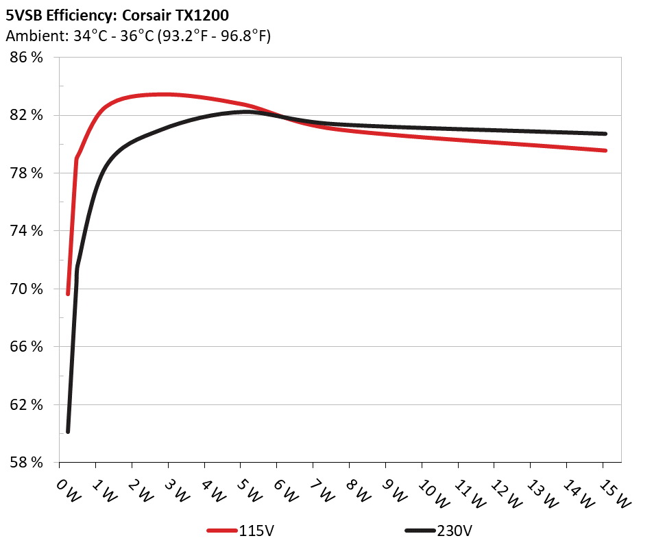 This graph depicts the efficiency levels of the 5VSB rail with 115V and 230V input
