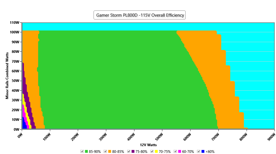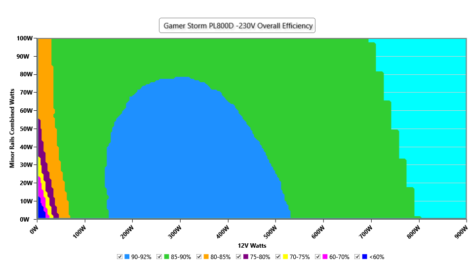 This graph depicts the PSU`s efficiency throughout its entire operational range. For the generation of the efficiency and noise graphs we set our loaders to auto mode through our custom-made software before trying thousands of possible load combinations