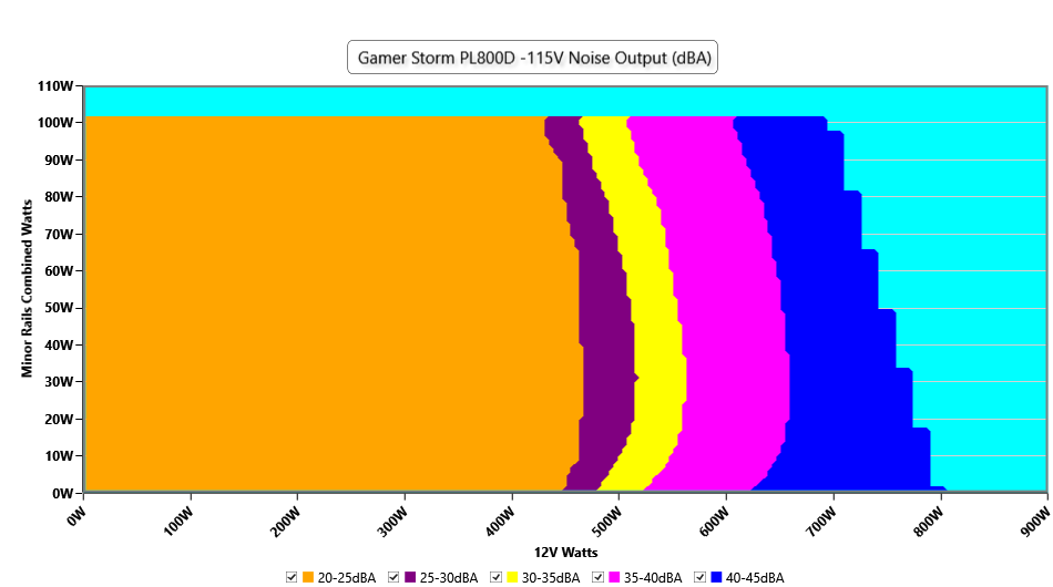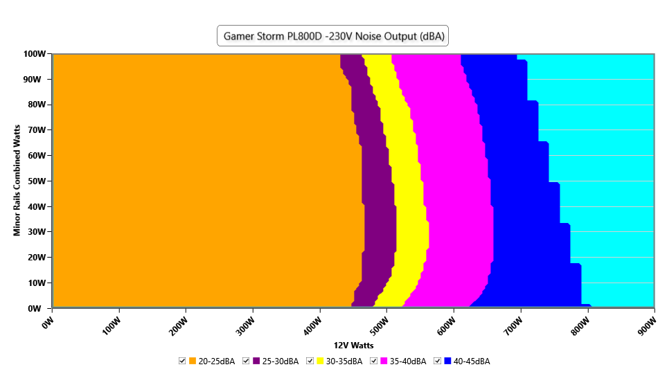 The PSU`s noise in its entire operational range and under 30-32 °C ambient is depicted in this graph. The X axis represents the load on the +12V rail(s) while the Y axis is the load on the minor rails