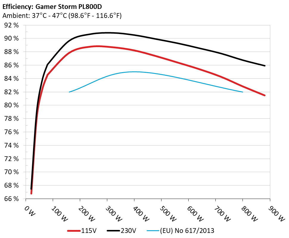 The PSU`s efficiency under high ambient temperatures with 115V and 230V input. For this graph the results of the 10-110% load regulation table are used