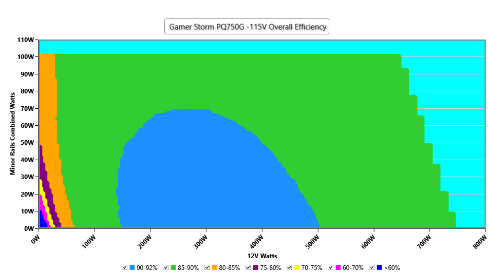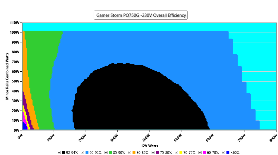 This graph depicts the PSU`s efficiency throughout its entire operational range. For the generation of the efficiency and noise graphs we set our loaders to auto mode through our custom-made software before trying thousands of possible load combinations