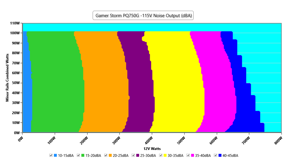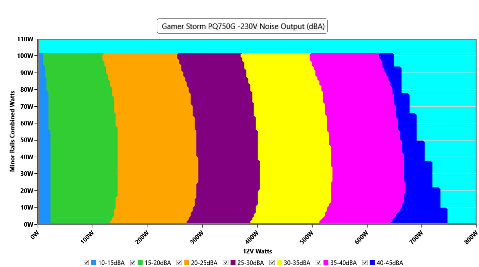 The PSU`s noise in its entire operational range and under 30-32 °C ambient is depicted in this graph. The X axis represents the load on the +12V rail(s) while the Y axis is the load on the minor rails