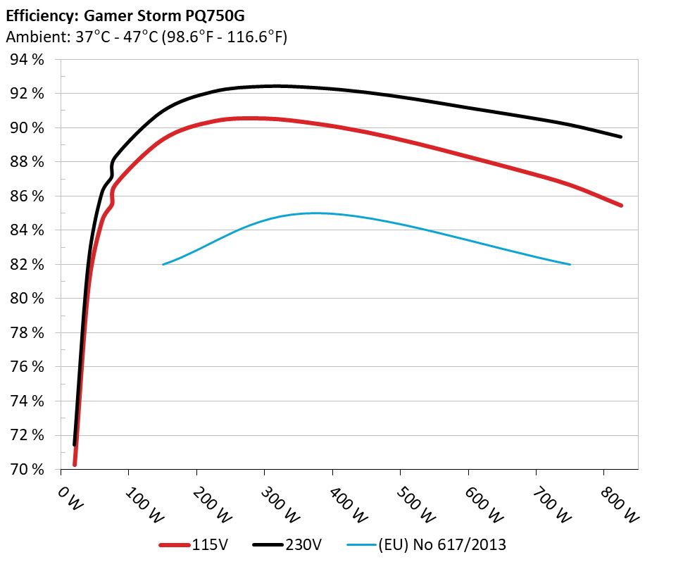 The PSU`s efficiency under high ambient temperatures with 115V and 230V input. For this graph the results of the 10-110% load regulation table are used