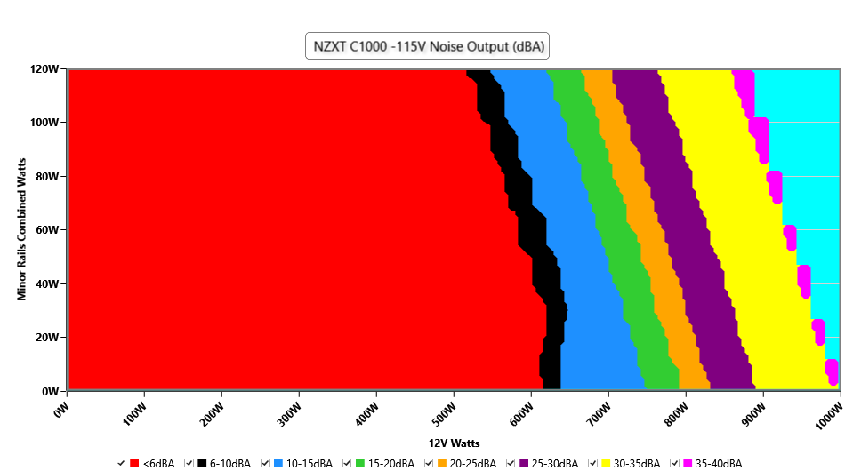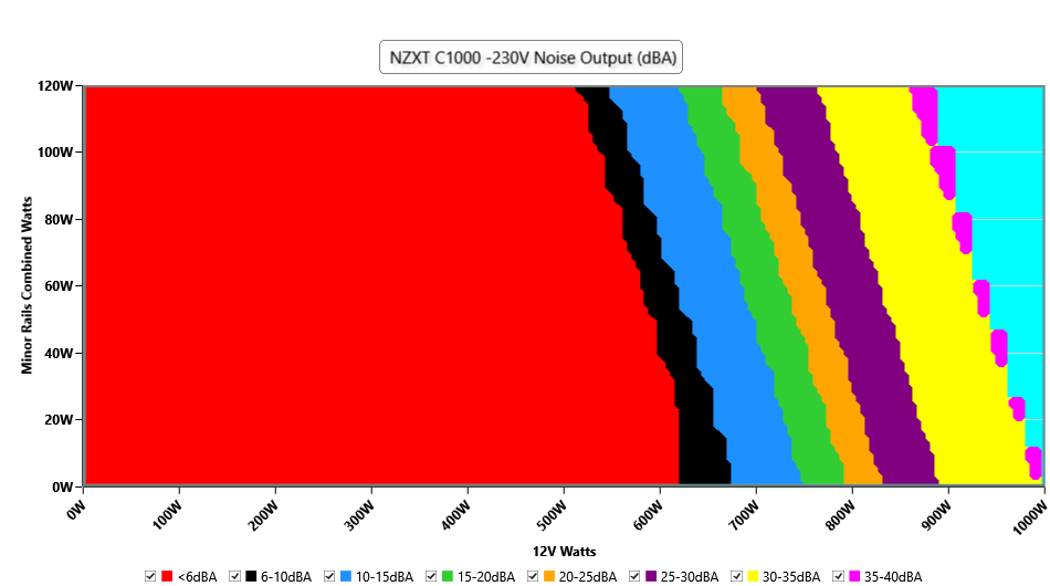 The PSU`s noise in its entire operational range and under 30-32 °C ambient is depicted in this graph. The X axis represents the load on the +12V rail(s) while the Y axis is the load on the minor rails