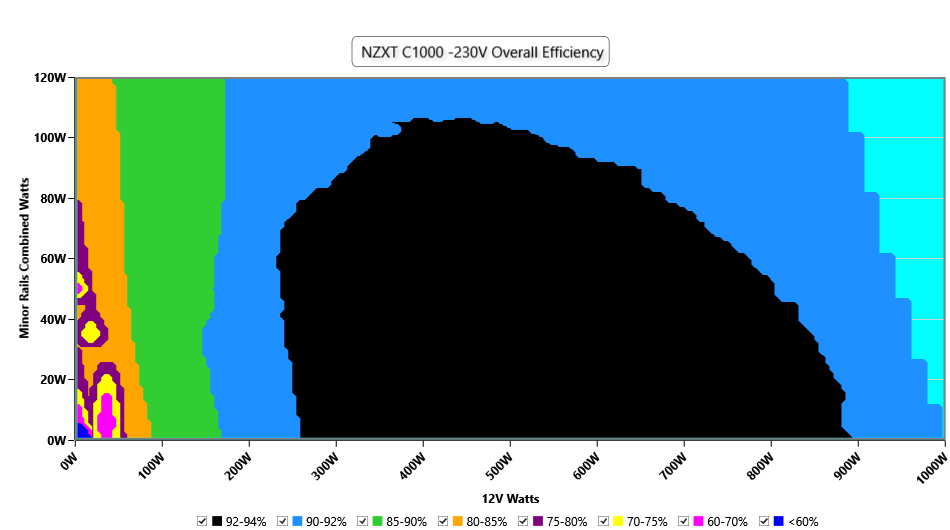 This graph depicts the PSU`s efficiency throughout its entire operational range. For the generation of the efficiency and noise graphs we set our loaders to auto mode through our custom-made software before trying thousands of possible load combinations