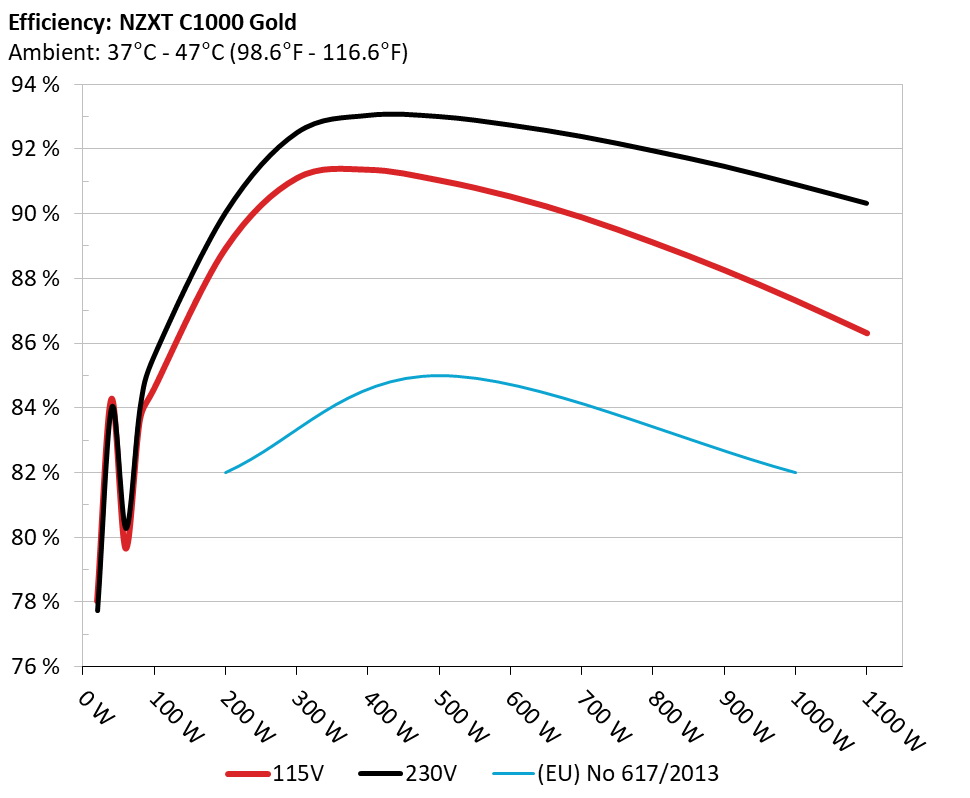The PSU`s efficiency under high ambient temperatures with 115V and 230V input. For this graph the results of the 10-110% load regulation table are used