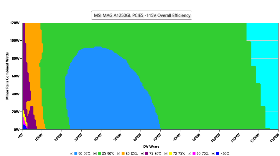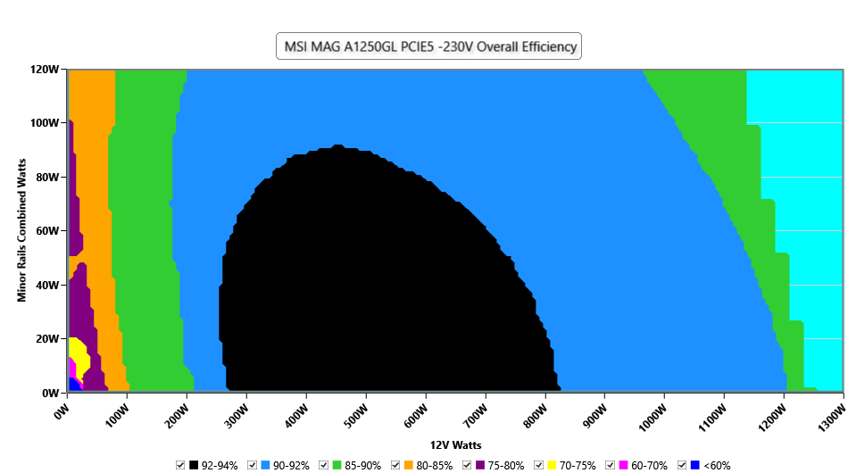 This graph depicts the PSU`s efficiency throughout its entire operational range. For the generation of the efficiency and noise graphs we set our loaders to auto mode through our custom-made software before trying thousands of possible load combinations