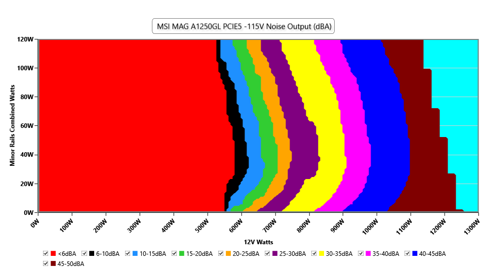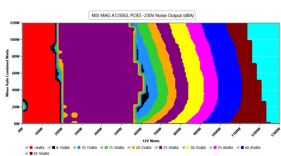 The PSU`s noise in its entire operational range and under 30-32 °C ambient is depicted in this graph. The X axis represents the load on the +12V rail(s) while the Y axis is the load on the minor rails