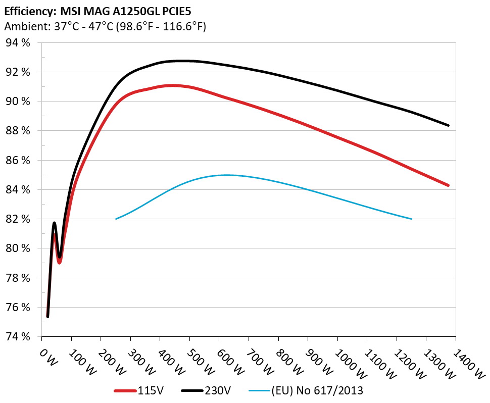 The PSU`s efficiency under high ambient temperatures with 115V and 230V input. For this graph the results of the 10-110% load regulation table are used