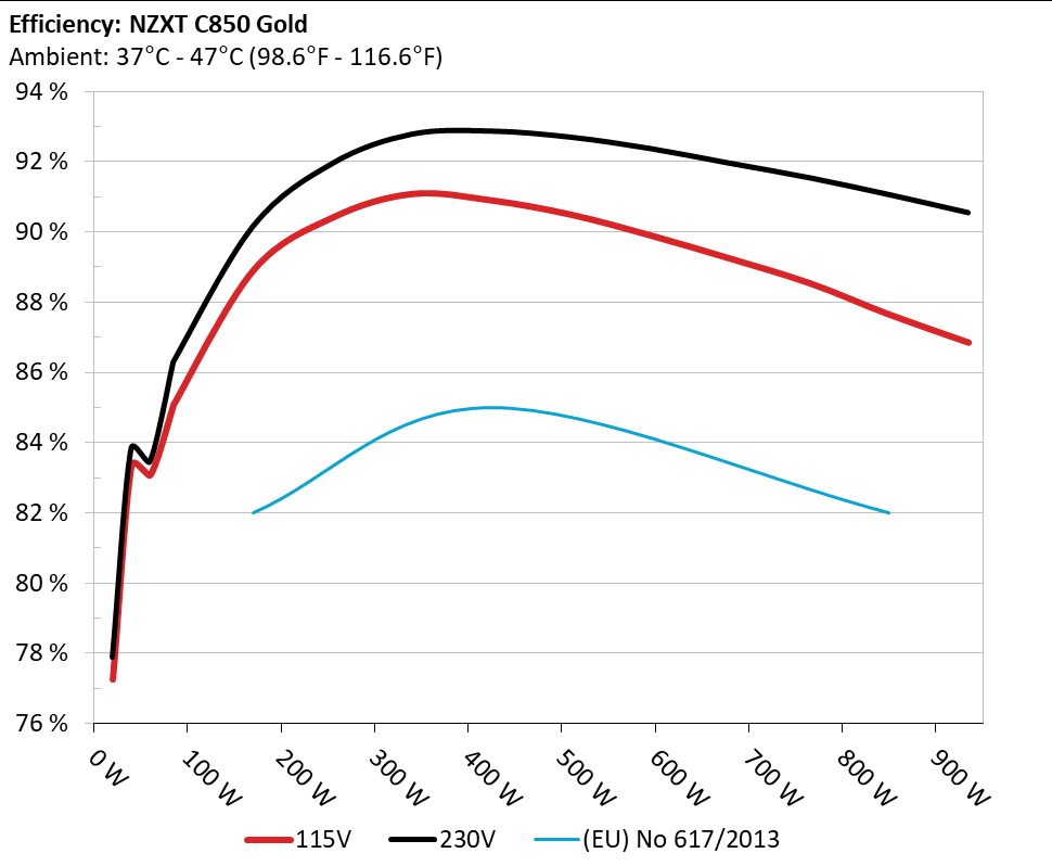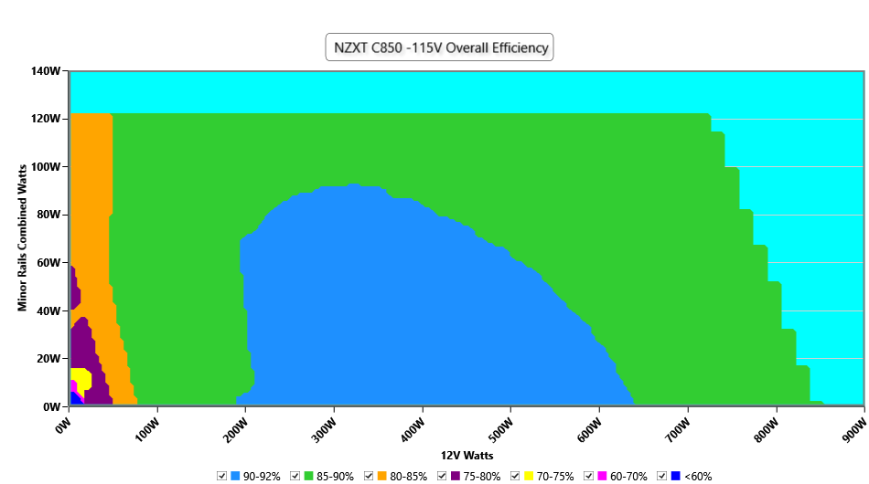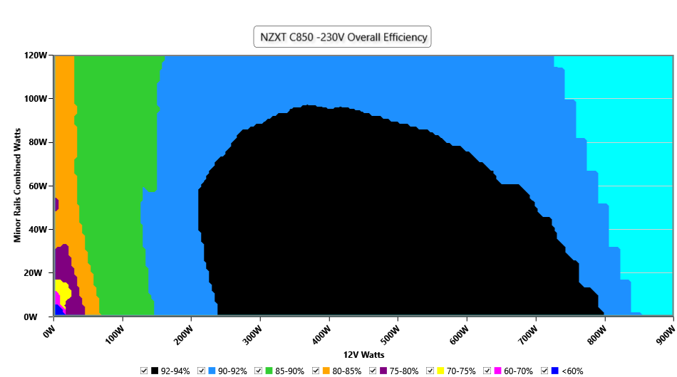 This graph depicts the PSU`s efficiency throughout its entire operational range. For the generation of the efficiency and noise graphs we set our loaders to auto mode through our custom-made software before trying thousands of possible load combinations